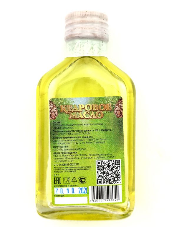 100 % Нерафинированное кедровое масло холодного отжима.